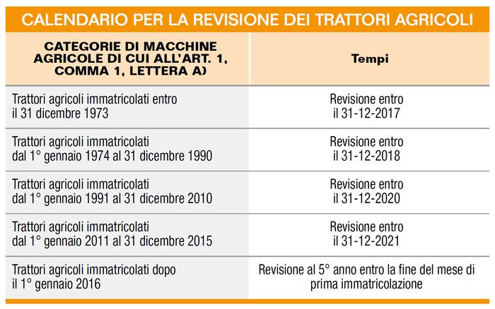 Il documento si chiude con un allegato che riporta i tempi entro cui effettuare la revisione in base ai periodi di immatricolazione dei trattori. Secondo il documento i primi a dover essere sottoposti a revisione (entro il 31 dicembre 2017) saranno i trattori immatricolati entro il 31 dicembre 1973.