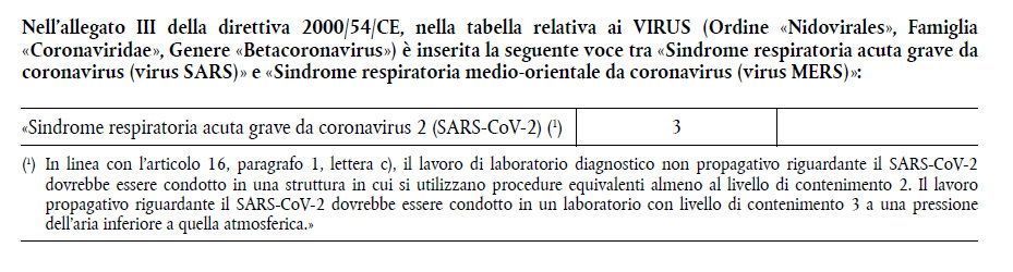Nota1 (Aggiornamento): Con Direttiva 2020/739/UE del 3 giugno 2020 (estratto in immagine qui sotto), il SARS-CoV-2 è stato ri-classificato in “gruppo 3” in ragione della particolare gravità, della contagiosità e della rapida diffusione nella popolazione (mondiale).