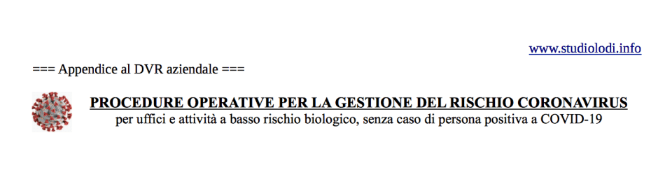 Tale procedura la mettiamo online affinché possa risultare di comodo spunto anche per aziende non clienti che intendono redigere una propria linea guida oppure utilizzando la nostra tal quale (intestandola in alto a sinistra con timbro aziendale e considerandola in appendice al DVR aziendale) ma senza nostra responsabilità in quanto tale utilizzo esula da collaborazione professionale (noi, infatti, ci rivolgiamo ai nostri clienti a fronte di apposito mandato ed in alcune situazioni forniamo indicazioni differenti, es. per gli ambienti sanitari per ovvie ragioni…).