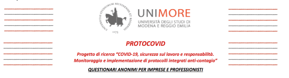 Si informa la clientela e, in generale, Aziende e Professionisti del territorio modenese, che l’Università degli Studi di Modena e Reggio Emilia sta raccogliendo dati nell’ambito di un progetto di ricerca intitolato “COVID-19, sicurezza sul lavoro e responsabilità. Monitoraggio e implementazione di protocolli integrati anti-contagio” (soprannominato PROTOCOVID).