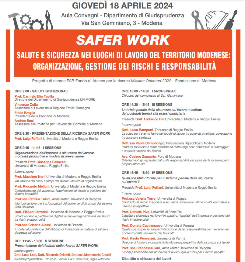 Informiamo che il progetto di ricerca SAFER WORK dell’Università degli Studi di Modena e Reggio Emilia, sul tema Salute e Sicurezza nel territorio modenese, sta per concludersi. Il gruppo di ricerca esporrà i risultati nel convegno del 18 aprile insieme alle relazioni degli illustri relatori convocati e agli interventi programmati di tre aziende selezionate per raccontarci la loro esperienza.