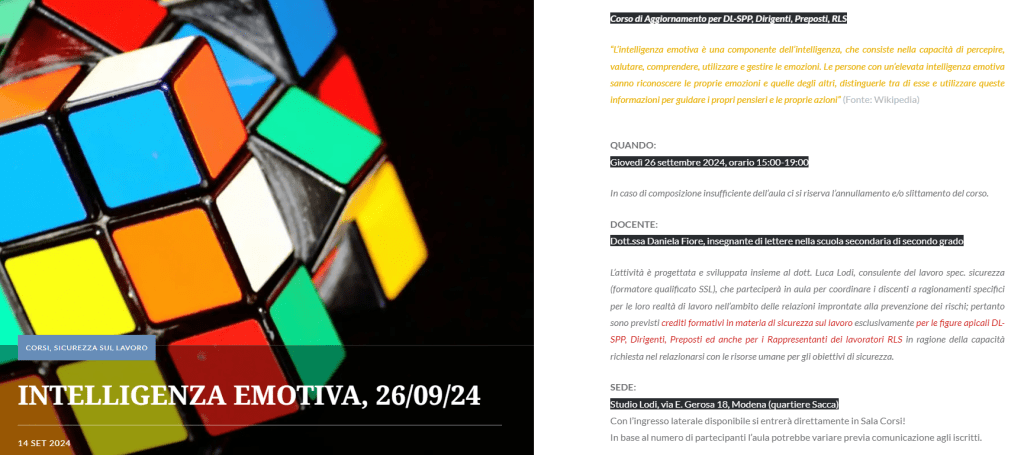 Come noto i corsi non li pubblichiamo nelle notizie dello Studio per non disturbare la clientela che riceve la newsletter, ma li indichiamo sulla vetrina dedicata www.igienesicurezzamodena.com con diffusione agli iscritti e sui social web collegati; tuttavia, in questo caso preme diffondere l’iniziativa perché può risultare utile alle figure aziendali apicali nonché ai rappresentanti dei lavoratori per gestire meglio le relazioni di lavoro o a porre alcune riflessioni (ovviamente con l’obiettivo di garantire la sicurezza, ma l’utilità può essere molteplice data l’importanza che ha l’intelligenza emotiva nella gestione del personale).