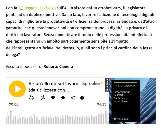Il 10 ottobre è entrata in vigore la legge n. 132/2025 che punta ad un quadro di regole (delegando il governo a disciplinare nel merito) per l’uso dell’intelligenza artificiale (anche[*]) nei luoghi di lavoro ove abbiano impatto sulle risorse umane. Rimandiamo all’ascolto del podcast di Roberto Camera, esperto di diritto del lavoro (già funzionario dell’ispettorato del lavoro di Modena), che illustra sinteticamente gli obiettivi della norma e le garanzie dovute nel rapporto di lavoro.